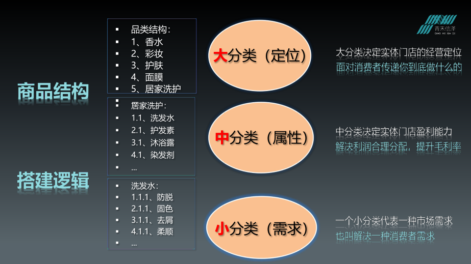 中分類(lèi)再往下分是小分類(lèi)。比如洗發(fā)水這一中分類(lèi),小分類(lèi)可以分為防脫、固色、去屑、柔順、修護(hù)等。需要強(qiáng)調(diào)的是,防脫、去屑、染發(fā)等這些小分類(lèi),就代表了一個(gè)個(gè)的市場(chǎng)細(xì)分需求。