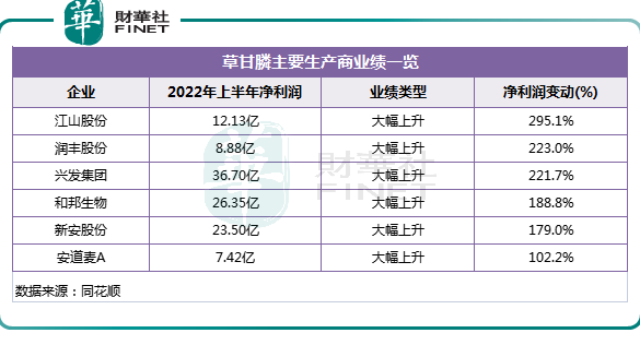 草甘膦高景氣度加持下,今年上半年,多家以草甘膦為主營產(chǎn)品的上市公司盈利能力大幅抬升。據(jù)筆者統(tǒng)計(jì),除潤豐股份外,江山股份實(shí)現(xiàn)歸母凈利潤為12.13億元,同比暴增2.95倍;興發(fā)集團(tuán)上半年凈利潤同比增長超2倍;業(yè)績實(shí)現(xiàn)翻倍增長的還有新安股份、安道麥A等。