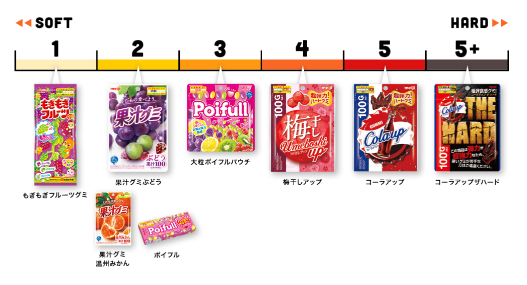 對此日本明治為旗下軟糖產(chǎn)品繪制“質(zhì)地圖表”,按柔軟度順序分為1、2、3、4、5、5+六個等級,并在產(chǎn)品包裝上印有表示等級的標(biāo)記以方便消費(fèi)者選購適合自己的軟糖。