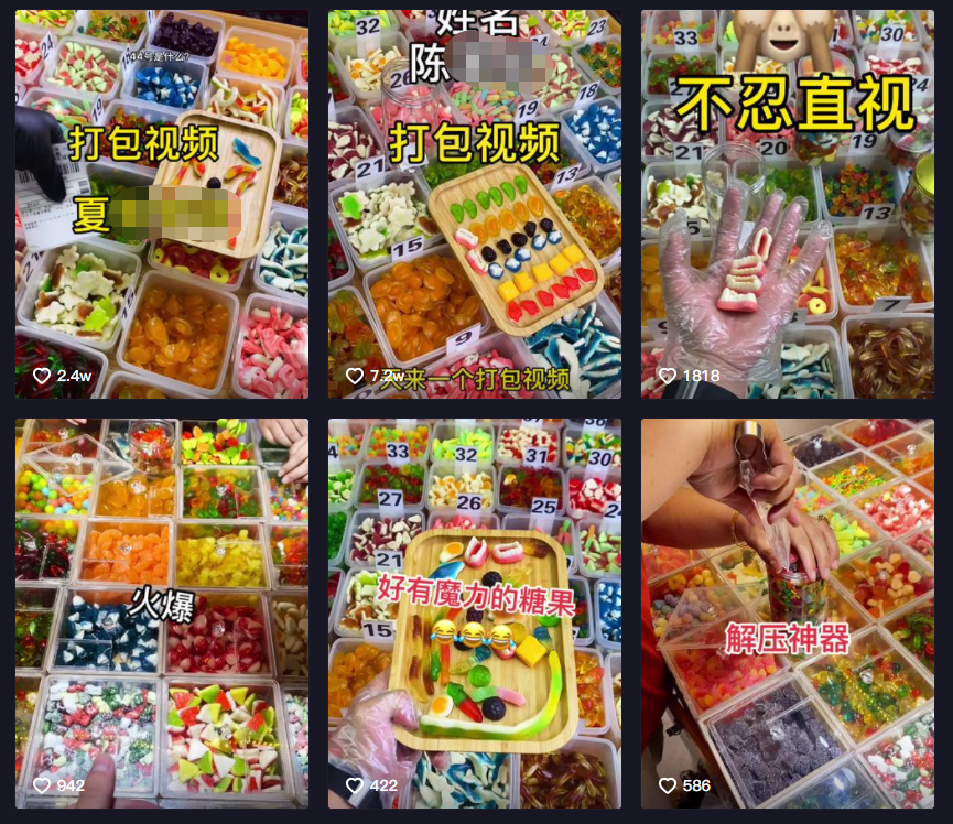 這放在心理學(xué)中就是一種“曝光效應(yīng)”?;蛟S剛開始用戶僅僅只是為了解壓而選擇觀看這些打包視頻,而當(dāng)熟悉的糖果重復(fù)出現(xiàn)時,原本沒有購買需求的消費(fèi)者也會在此過程中越看越喜歡,從而產(chǎn)生消費(fèi)沖動。