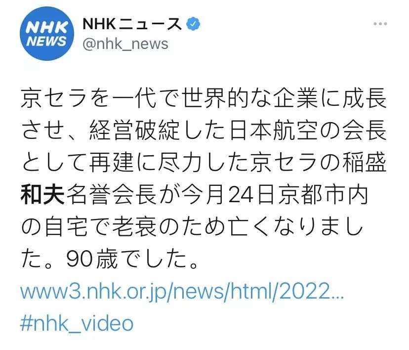 據(jù)NHK(日本廣播協(xié)會(huì))8月30日消息,著名企業(yè)家、京瓷名譽(yù)會(huì)長(zhǎng)稻盛和夫去世,終年90歲。