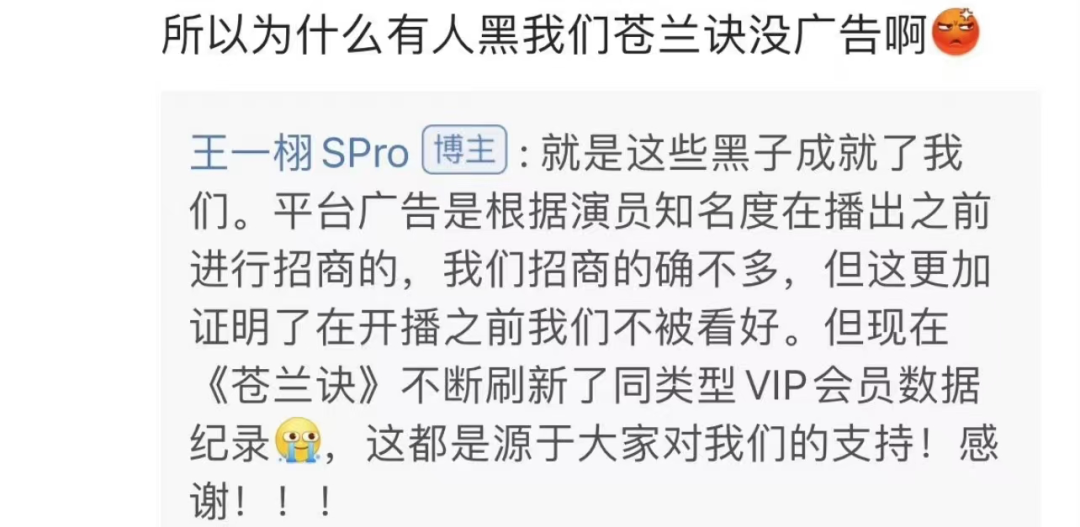 不少人的預(yù)期里,這個暑期檔的主角會是《星漢燦爛》和《沉香如屑》,《蒼蘭訣》只能以低姿態(tài)搏一搏;觀眾這么想,廣告主也這么想,恒星引力CEO、制片人王一栩發(fā)微博直言,“平臺廣告是根據(jù)演員知名度招商的”,言下之意,該劇不被看好,初始的招商不算高規(guī)格。