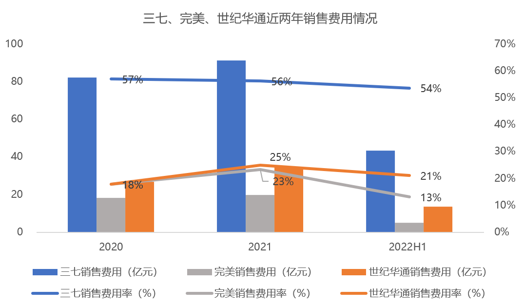 雖然三七互娛銷售費(fèi)用首次出現(xiàn)下滑,但銷售費(fèi)用絕對(duì)金額依然遠(yuǎn)高于同行,且銷售費(fèi)用率仍超過50%。上半年,由于版號(hào)暫停,游戲廠商新游數(shù)量普遍較少,完美世界、世紀(jì)華通的銷售費(fèi)用也隨之下滑,且下降幅度遠(yuǎn)超三七互娛。