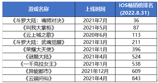 截至目前,三七互娛近兩年上線的新游只有《斗羅大陸:魂師對(duì)決》、《叫我大掌柜》還在IOS暢銷榜前100,《云上城之歌》排在113名,其余游戲已經(jīng)跌出了前200名。