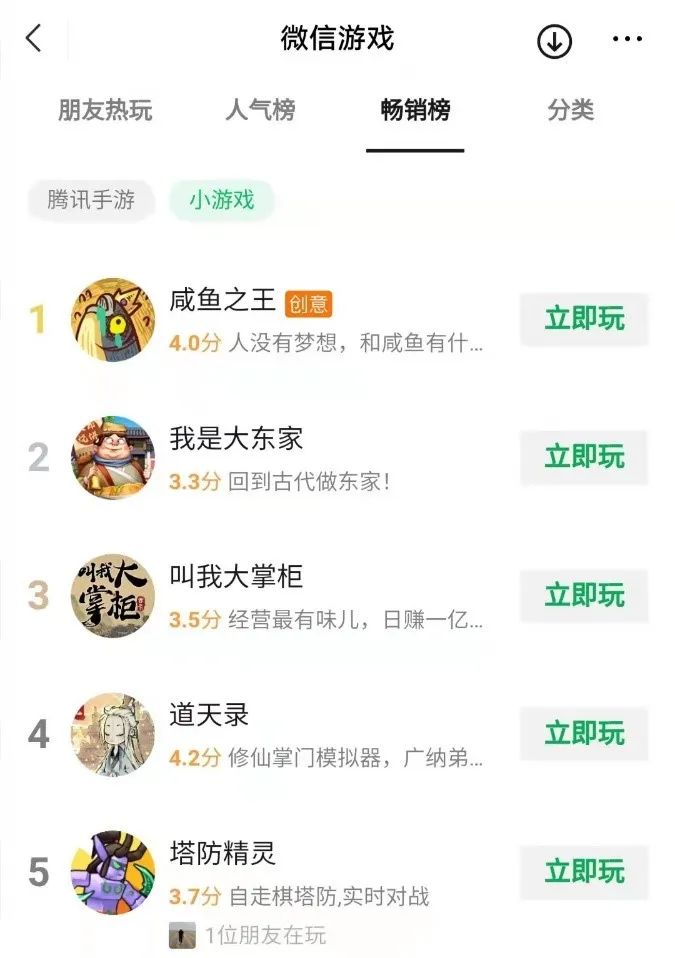 小程序核心依托于微信生態(tài)用戶群,用戶數(shù)量龐大,此外小程序渠道的發(fā)行新進(jìn)CPA會(huì)比較低,相應(yīng)的轉(zhuǎn)化率也會(huì)比較高。目前三七互娛旗下《叫我大掌柜》穩(wěn)居小游戲暢銷榜TOP5,已經(jīng)吃到了微信小游戲的紅利。