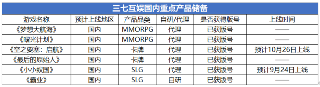 從產(chǎn)品儲(chǔ)備來看,三七互娛可謂貨源充足。旗下6款游戲已獲版號(hào),其中《空之要塞:?jiǎn)⒑健?、《小小蟻?guó)》兩款游戲即將上線。