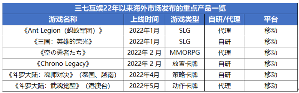 究其原因,上半年,三七互娛在國(guó)內(nèi)市場(chǎng)新品寥寥無幾,國(guó)內(nèi)收入增長(zhǎng)主要依靠2021年上線的《斗羅大陸:魂師對(duì)決》、《榮耀大天使》、《斗羅大陸:武魂覺醒》,以及《叫我大掌柜》、《云上城之歌》、《斗羅大陸》H5等老游戲。