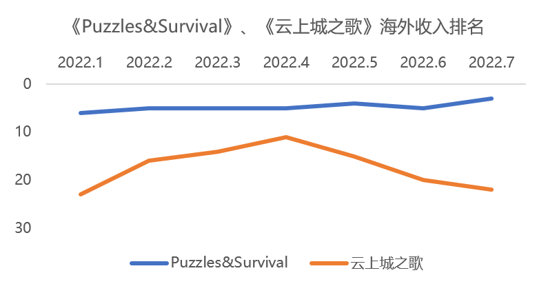 三七互娛出海主力產(chǎn)品表現(xiàn)依然強(qiáng)勁。根據(jù)易娛官網(wǎng),《Puzzles&Survival》最高單月流水超2.9億,截至2022年7月累計(jì)流水達(dá)46.3億。