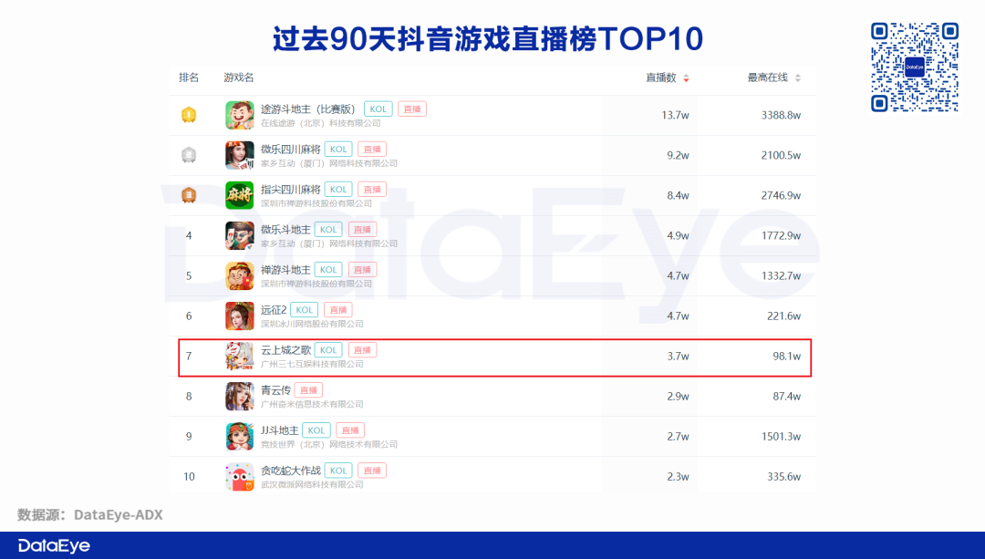 根據(jù)DataEye-ADX數(shù)據(jù)顯示,過去90天,《云上城之歌》直播場(chǎng)數(shù)位列抖音游戲直播榜第7名。