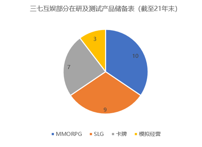 截至21年末,三七互娛儲(chǔ)備游戲29款,從儲(chǔ)備游戲來看公司已形成SLG、MMORPG、卡牌、模擬經(jīng)營(yíng)多元化發(fā)展的格局,對(duì)傳統(tǒng)ARPG類游戲的依賴度有所降低。