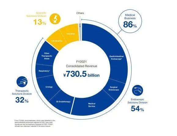奧林巴斯2021財(cái)年的數(shù)據(jù)顯示,7305億日元中,醫(yī)療領(lǐng)域收入占比高達(dá)86%。
