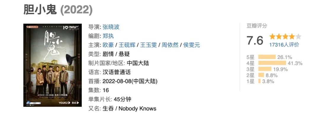 可如若你翻開社交平臺(tái)有關(guān)該劇的討論,會(huì)發(fā)現(xiàn)仍有相當(dāng)一部分堅(jiān)持追劇的觀眾如劇中的“大詩人”王頔一樣,醉心于劇情進(jìn)展和人物命運(yùn)并時(shí)不時(shí)發(fā)表長(zhǎng)段的追劇感悟。而豆瓣上17160人打出7.6分,也昭示了《膽小鬼》并沒有輸?shù)艨诒?/p>