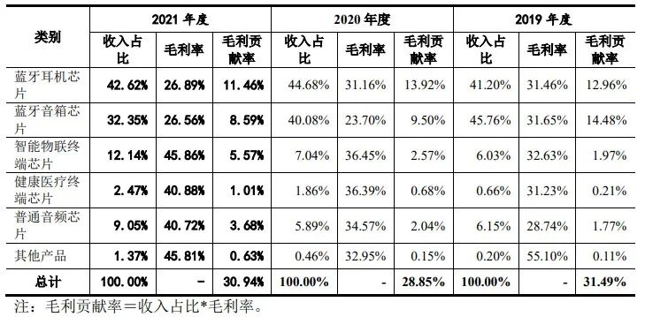 招股書顯示,2019年至2021年,杰理科技藍(lán)牙耳機(jī)芯片平均單價(jià)分別為1.56元/顆、1.38元/顆和1.29元/顆,藍(lán)牙音箱芯片平均單價(jià)為1.71元/顆、1.48元/顆和1.44元/顆。
