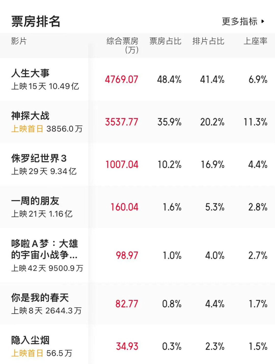 《隱入塵煙》上映當(dāng)日,前有《人生大事》余威仍在,后有《外太空的莫扎特》虎視眈眈,與它同天上映的《神探大戰(zhàn)》也是來勢洶洶。從整體局面看來,《隱入塵煙》無法占到任何便宜,也確實沒有占到便宜,上映首日用2.3%的排片,收獲不到35萬的票房,票房占當(dāng)日大盤的0.3%。