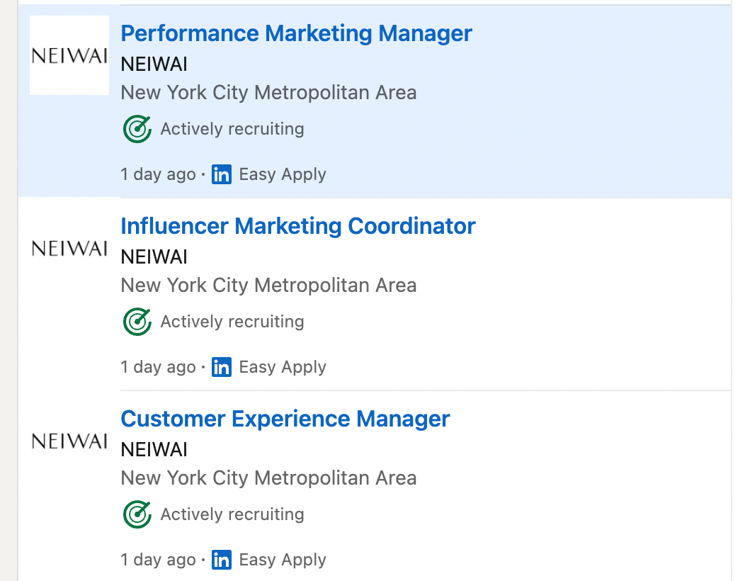 2020年,內(nèi)外原本打算在舊金山開出美國第一家線下門店,但因為疫情被耽擱,不過團隊倒是陸續(xù)搭建了起來.如今,他們還在積極地尋找去往紐約大區(qū)的客戶體驗經(jīng)理、市場營銷經(jīng)理和KOL營銷專員。