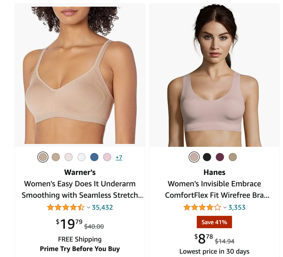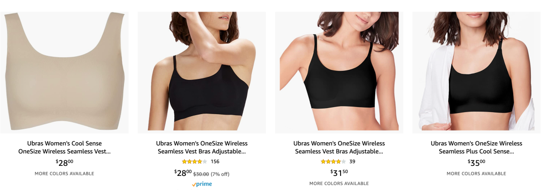 在價格帶上,Ubras和內(nèi)外和本土品牌相比并沒有很大優(yōu)勢。內(nèi)衣品牌Hanes最近把一款「類無尺碼」的無縫舒適內(nèi)衣」的亞馬遜渠道價格,壓到了8.78美金。另外三家內(nèi)衣品牌Maidenform、Bali、Warner’s也把類似的基本款也降到20美金以下。