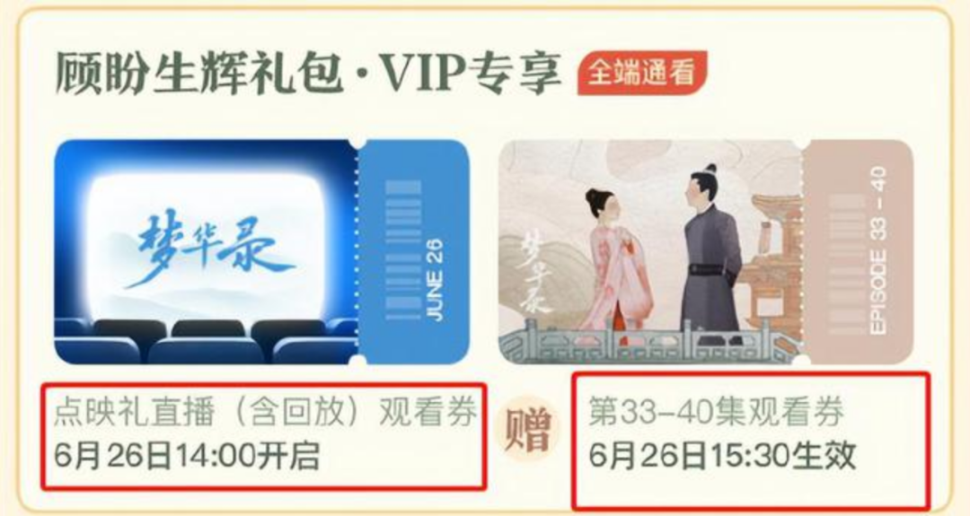 以2019年播出的爆款古裝劇《陳情令》為例,它在收官之前,推出以30元的價格提前收看大結(jié)局5集內(nèi)容的超前點播服務(wù)。而今《夢華錄》等劇集將價格定在18元購買大結(jié)局點映禮包,以《夢華錄》為例“顧盼生輝”的點映禮包包括點映禮直播劵和贈送的第22-40集劇集的觀看劵。主演陪看服務(wù)、更低價的直通結(jié)局以及一場具備儀式感的收官直播會等,這些對比高價且只包含劇集內(nèi)容的“超前點播”服務(wù)顯然更令用戶覺得滿足。