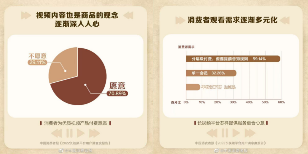 根據(jù)《2022長視頻平臺用戶滿意度報告》數(shù)據(jù)顯示,超過70%的消費(fèi)者愿意為優(yōu)質(zhì)視頻內(nèi)容付費(fèi),近60%的用戶愿意分層級付費(fèi),但希望平臺能夠提前告知規(guī)則,可見大多數(shù)用戶是具備付費(fèi)意識的,并且能夠接受分級付費(fèi)模式,平臺C化發(fā)展擁有了充分條件。