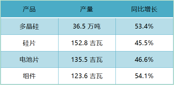 今年以來,光伏產(chǎn)業(yè)鏈主要環(huán)節(jié)保持強勁發(fā)展勢頭,多晶硅、硅片、電池、組件產(chǎn)量同比增長均在45%以上。