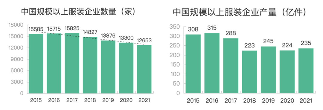 國家統(tǒng)計局?jǐn)?shù)據(jù)顯示,2021年規(guī)模以上服裝企業(yè)數(shù)量減少至1.27萬家,減少647家。規(guī)模以上服裝企業(yè)產(chǎn)量從2016年的315億件降到了2021年的235億件。