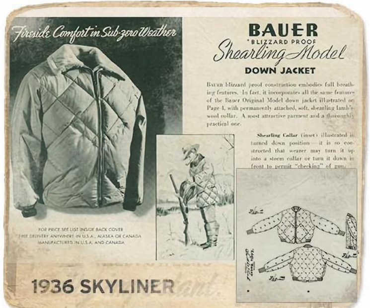 現(xiàn)代意義上的羽絨服誕生于1936年,由美國人埃迪·鮑爾(Eddie Bauer)發(fā)明。他創(chuàng)造性地將羽絨被所用的絎縫技法(把衣服縫成一個個“隔斷”再填充絨)運(yùn)用到服裝面料上,解決了羽絨下滑與分布不均問題。1940年,鮑爾為自己發(fā)明的絎縫鵝絨外套Skyliner申請了專利。