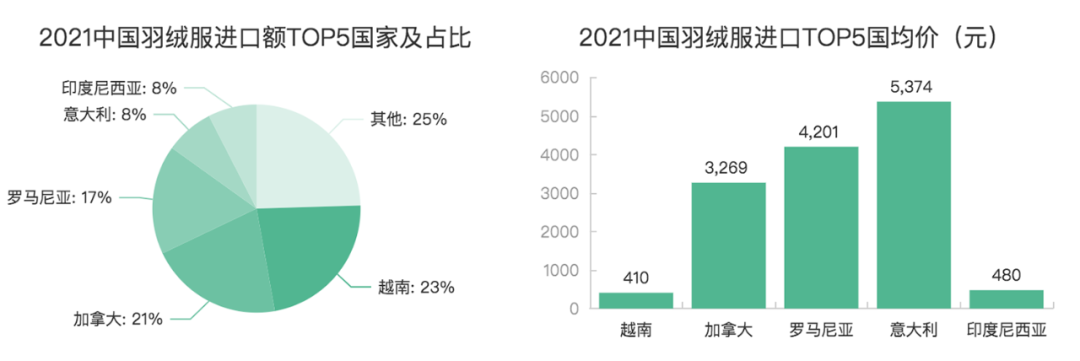 海關(guān)總署數(shù)據(jù)顯示,2017年后中國羽絨服進(jìn)口總額持續(xù)增長,2021年達(dá)53億元,同比增長56%。其中,進(jìn)口羽絨服總額TOP5國家分別為越南、加拿大、羅馬尼亞、意大利和印度尼西亞,來自加拿大、羅馬尼亞、意大利的羽絨服單件均價超3000元。