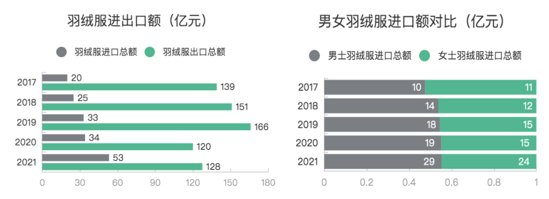 3 男裝羽絨服市場消費(fèi)需求正在打開。海關(guān)總署數(shù)據(jù)顯示,2018年開始,中國羽絨服進(jìn)口總額連續(xù)增長,2021年達(dá)53億元。其中,男士羽絨服進(jìn)口總額達(dá)29億元,進(jìn)口量342萬件,均超女士羽絨服。