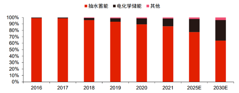 根據(jù)中國(guó)能源研究會(huì)儲(chǔ)能專委會(huì)的全球儲(chǔ)能項(xiàng)目庫(kù)不完全統(tǒng)計(jì),截至 2021 年底,中國(guó)已投運(yùn)電力儲(chǔ)能項(xiàng)目累計(jì)裝機(jī)規(guī)模中,抽水蓄能的累計(jì)裝機(jī)規(guī)模占比達(dá)86.3%,占據(jù)主導(dǎo)地位;新型儲(chǔ)能累計(jì)裝機(jī)規(guī)模占比12.5%,包括電池(鋰離子、鉛蓄、液流等)、壓縮空氣、超級(jí)電容、飛輪等。根據(jù)電化學(xué)儲(chǔ)能和其他儲(chǔ)能占比增速測(cè)算,預(yù)計(jì)2030年抽水蓄能占比為64%。