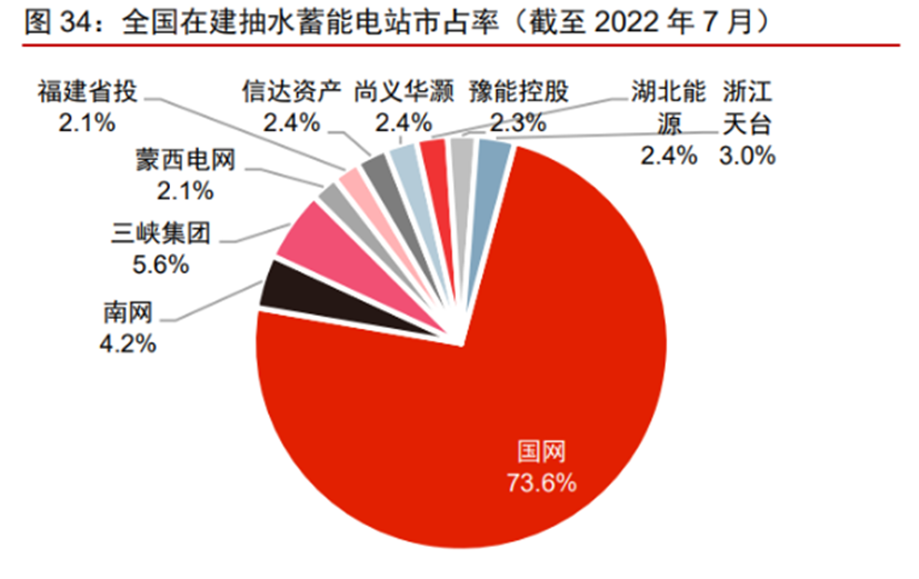 抽蓄電站投資主體多為電網(wǎng)企業(yè), 截至 2022 年 7 月,國(guó)網(wǎng)(含國(guó)網(wǎng)新源及國(guó)網(wǎng)地方子公司)、南網(wǎng)(南網(wǎng)雙調(diào),資產(chǎn)重組后將整體注入文山電力)、蒙西電網(wǎng)擁有的在運(yùn)抽蓄電站裝機(jī)量占我國(guó)在運(yùn)抽蓄電站裝機(jī)量的 63.3%、22.9%、2.7%,電網(wǎng)企業(yè)市占率近九成;發(fā)電企業(yè)三峽集團(tuán)、華電集團(tuán)裝機(jī)量占比為 4.7%、2.7%;另有其他企業(yè)江蘇國(guó)信、寧波能源裝機(jī)量占比 3.6%、0.2%?!冻樗钅苤虚L(zhǎng)期發(fā)展規(guī)劃(2021—2035 年)》 提出鼓勵(lì)社會(huì)資本投資建設(shè)抽水蓄能。由于抽蓄電站單體投資大、建設(shè)周期長(zhǎng),預(yù)計(jì)未來(lái)仍將保持電網(wǎng)主導(dǎo)、發(fā)電企業(yè)和其他企業(yè)參與的市場(chǎng)格局。