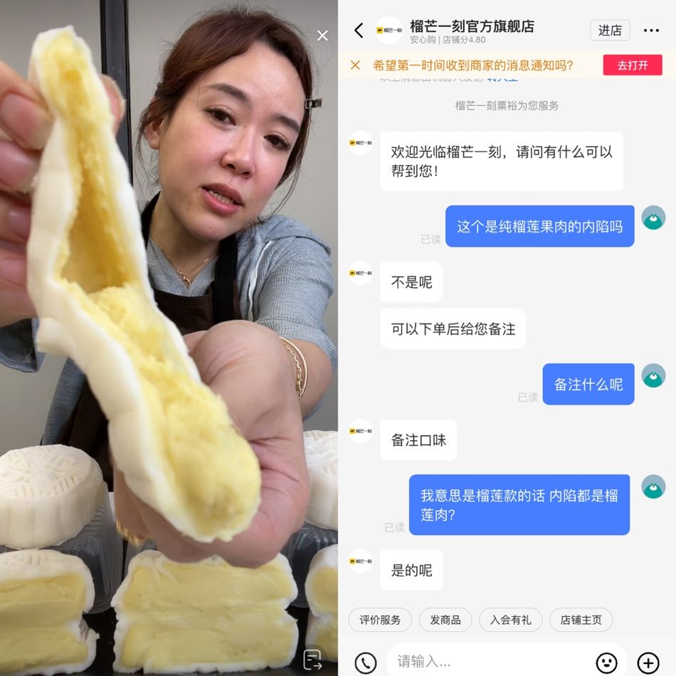 近期,一度走紅于各大平臺直播間的榴芒一刻旗下一款榴蓮冰皮月餅遭到大范圍的消費者投訴?!耙粫r聽信了主播的說辭,結(jié)果買到手根本就是幾塊冰皮綠豆糕,但主播帶貨的時候壓根沒提到餡料大部分是綠豆沙?!?3歲的吳珺馨原本是一個對所有月餅都無感的人,但因為喜歡吃榴蓮,才決定下單試試水,沒想到直接“翻了車”。