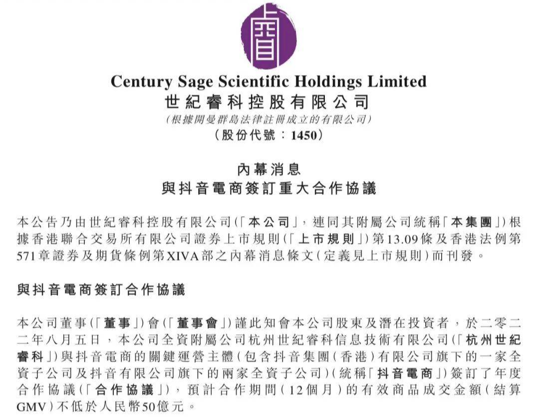 回到8月5日,世紀(jì)睿科宣布與抖音電商簽訂的50億“年框”協(xié)議。公告顯示,世紀(jì)睿科承諾直播間一年的GMV不低于50億元,在此基礎(chǔ)上,抖音會(huì)給到世紀(jì)睿科相應(yīng)的推廣服務(wù)費(fèi),或者精選聯(lián)盟技術(shù)服務(wù)費(fèi)優(yōu)惠金額。此外,抖音電商還將根據(jù)世紀(jì)??频腉MV的一定比例向杭州世紀(jì)??铺峁┵Y源支持。