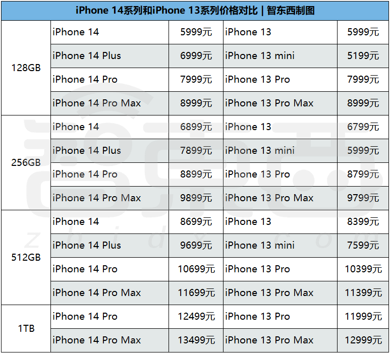 另外,iPhone 14 Plus的加入,除了降低大屏iPhone的價格門檻,也讓iPhone系列的價格過度更加平滑了,不同型號之間的價格差距均為1000元,不再有標準版到Pro版之間2000元的價格差距。
