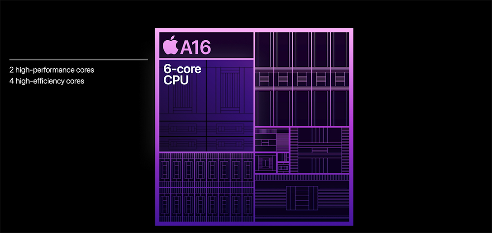 從芯片內(nèi)部設(shè)計來看,A16的CPU依然是2個性能大核加4個能效小核的設(shè)計,與A15相同,不過兩顆大核功耗相比上代下降了20%。