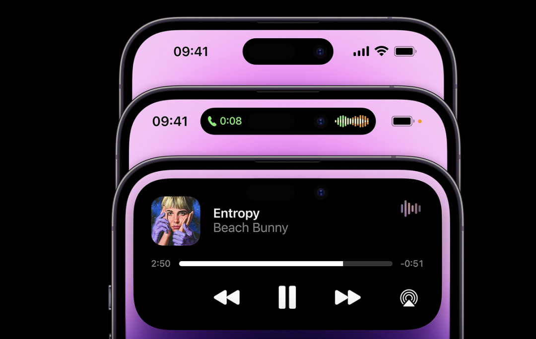 值得一提的是,蘋果這次自稱“靈動島”的屏幕開孔區(qū),“能大能小、能伸能縮”!明明有個打孔區(qū)域,蘋果硬是通過一系列“花招”就地取材,讓你感覺不到打孔的存在。