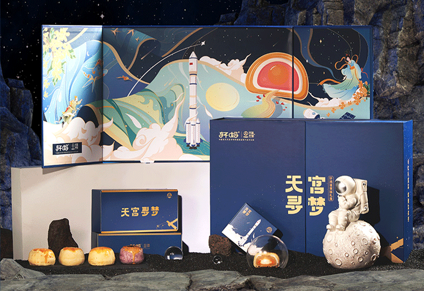 網(wǎng)紅品牌軒媽蛋黃酥在今年中秋月餅的制作上選擇了與中國航天天宮開物進行聯(lián)名,推出了以“星系探索旅程”為宣傳主題的天宮尋夢中秋禮盒,共含有黑松露蛋黃酥、白玉干貝酥、軒媽白玉蓮蓉酥、軒媽蛋黃酥桂花味、軒媽蛋黃酥紫薯味5款產(chǎn)品。