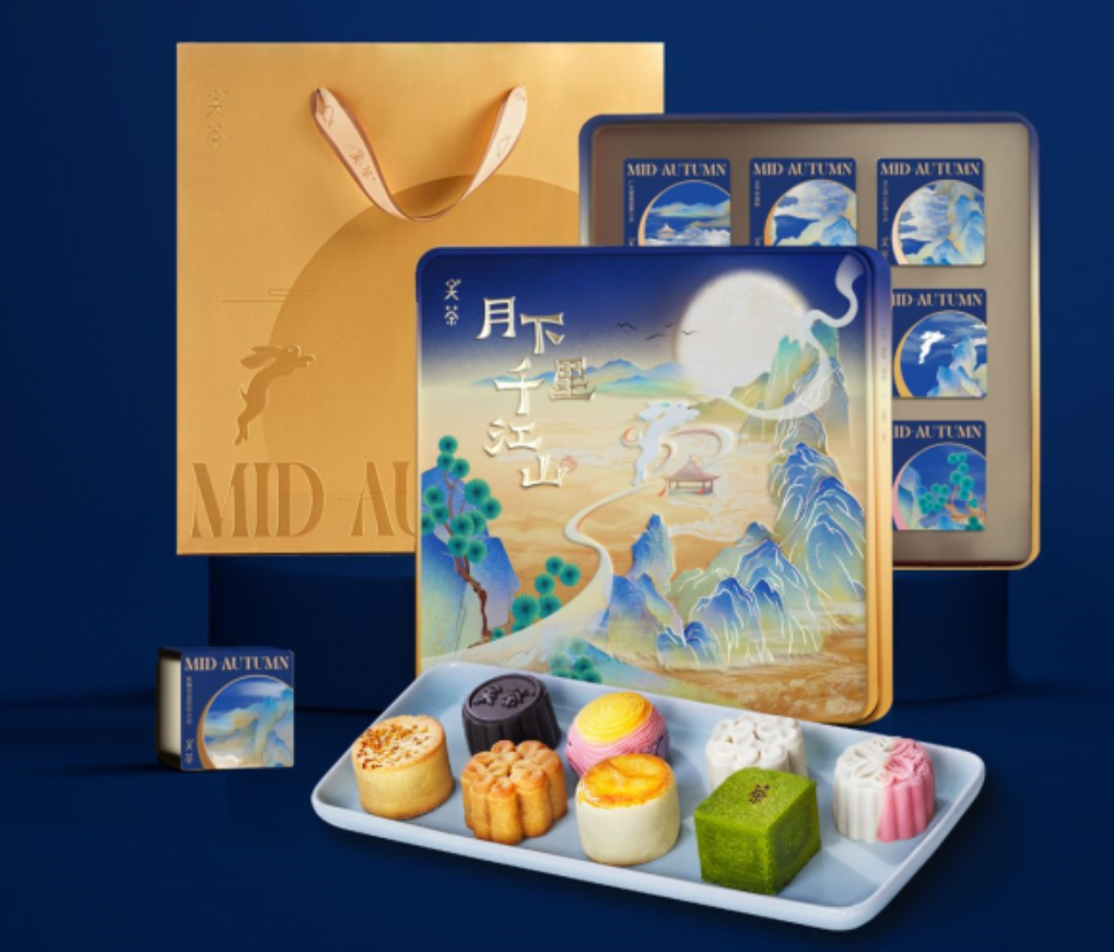 比如今年關茶新食禮上線了中國文化系列中秋食禮——4個系列11款不同設計思路的中秋禮盒,共計有8種不同口味、不同工藝、不同風格的精巧月餅以及3款質(zhì)感非凡、視覺張力飽滿的禮盒,分別是“月下千里江山”、“飛天逐月”和“你好,月球”。