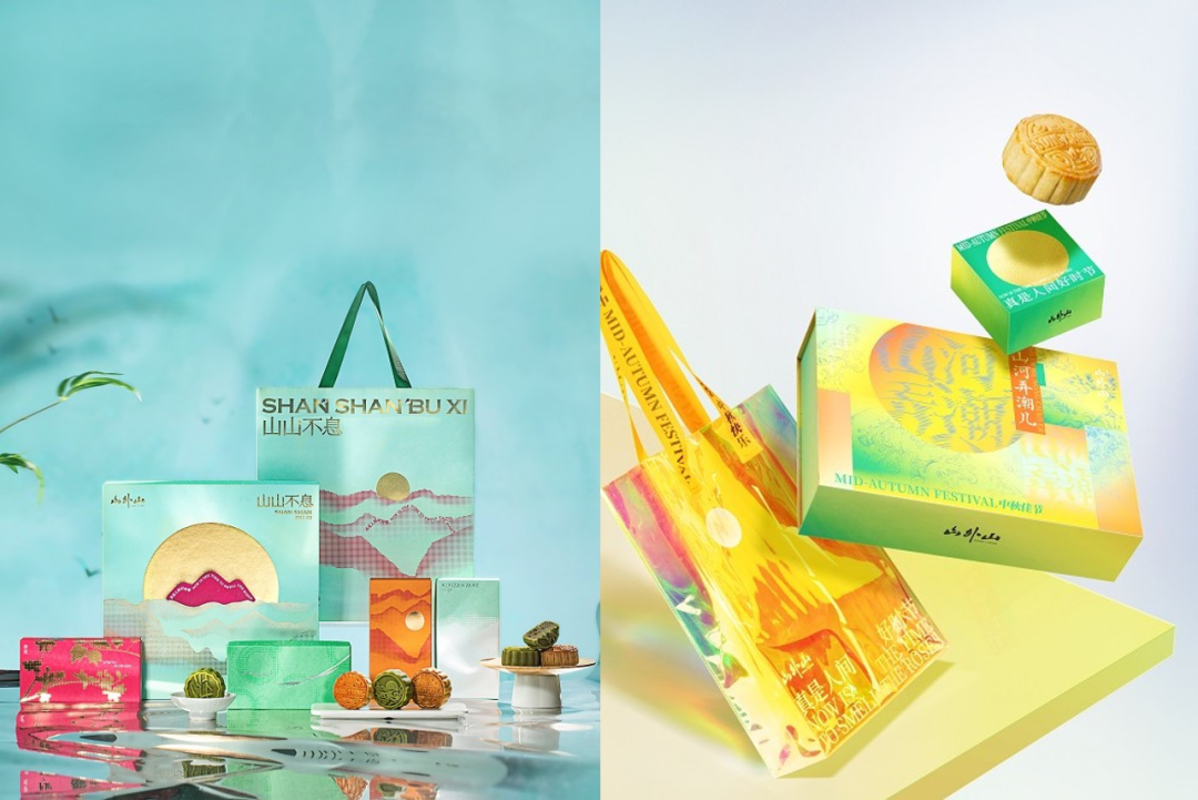 山山不息月餅禮盒則在包裝上通過鏤空藝術、亞克力山型窗口的設計,使得禮盒在打開過程中可窺見層層美景,見“山間之月”。山河弄潮兒禮盒外觀采用了璧山綠與大地黃的時尚撞色設計,由此來體現(xiàn)色彩交融的氤氳之美。
