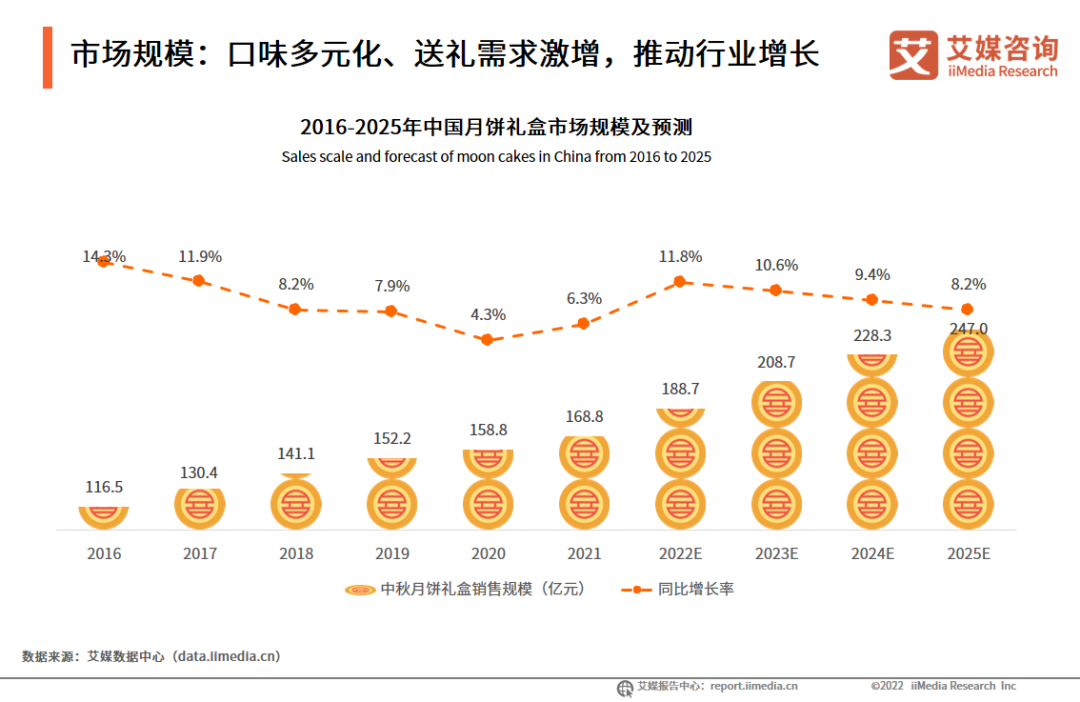 根據(jù)艾媒咨詢相關研究數(shù)據(jù),2016-2021年,中國月餅禮盒市場規(guī)模呈上升趨勢,預計今年的中國月餅禮盒銷售額可以達到188.7億元。而隨著消費者飲食升級,對月餅的口味需求多元化,以及節(jié)日送禮需求激增,預計2025年月餅禮盒市場規(guī)模將達到247.0億元。