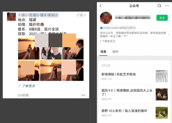 隨著互聯(lián)網(wǎng)的迅速發(fā)展,如今,多數(shù)婚紗旅拍商家開(kāi)始通過(guò)微信訂閱號(hào)、朋友圈定投的方式,引流到自己的公眾號(hào)加粉從而實(shí)現(xiàn)轉(zhuǎn)化和獲取客戶資源,據(jù)可靠數(shù)據(jù)反饋,這樣操作的客戶轉(zhuǎn)化率高達(dá)50%~70%。