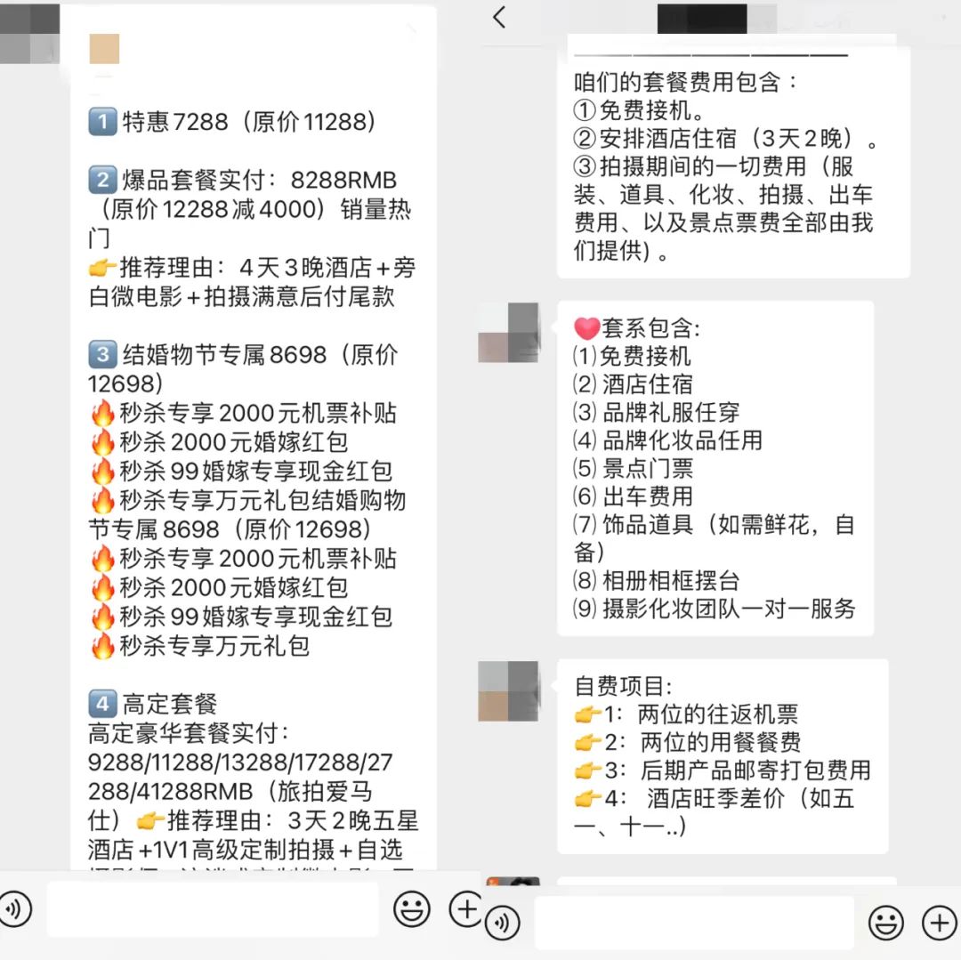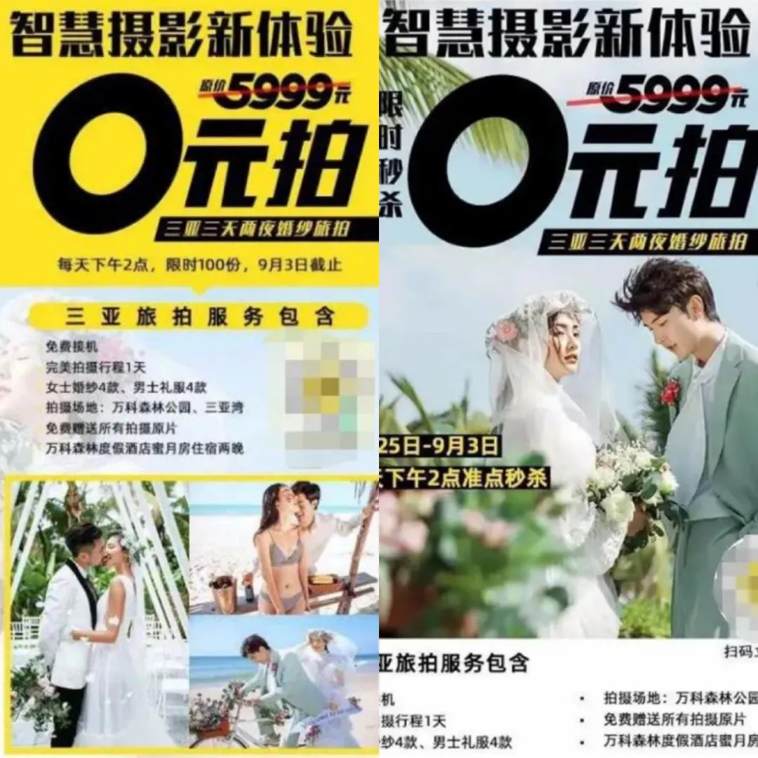 除了以超低價(jià)吸引消費(fèi)者,有些旅拍商家甚至直接打出了“0元旅拍”的噱頭。在挑選旅拍機(jī)構(gòu)時(shí),很多消費(fèi)者會(huì)掉入低價(jià)陷阱??吹匠偷膬r(jià)格和清一色的好評(píng)就心動(dòng)不已,但往往最后得到的不僅是一堆粗制濫造的照片,還會(huì)在拍攝過(guò)程中遭遇坐地抬價(jià)、捆綁銷售等問(wèn)題。