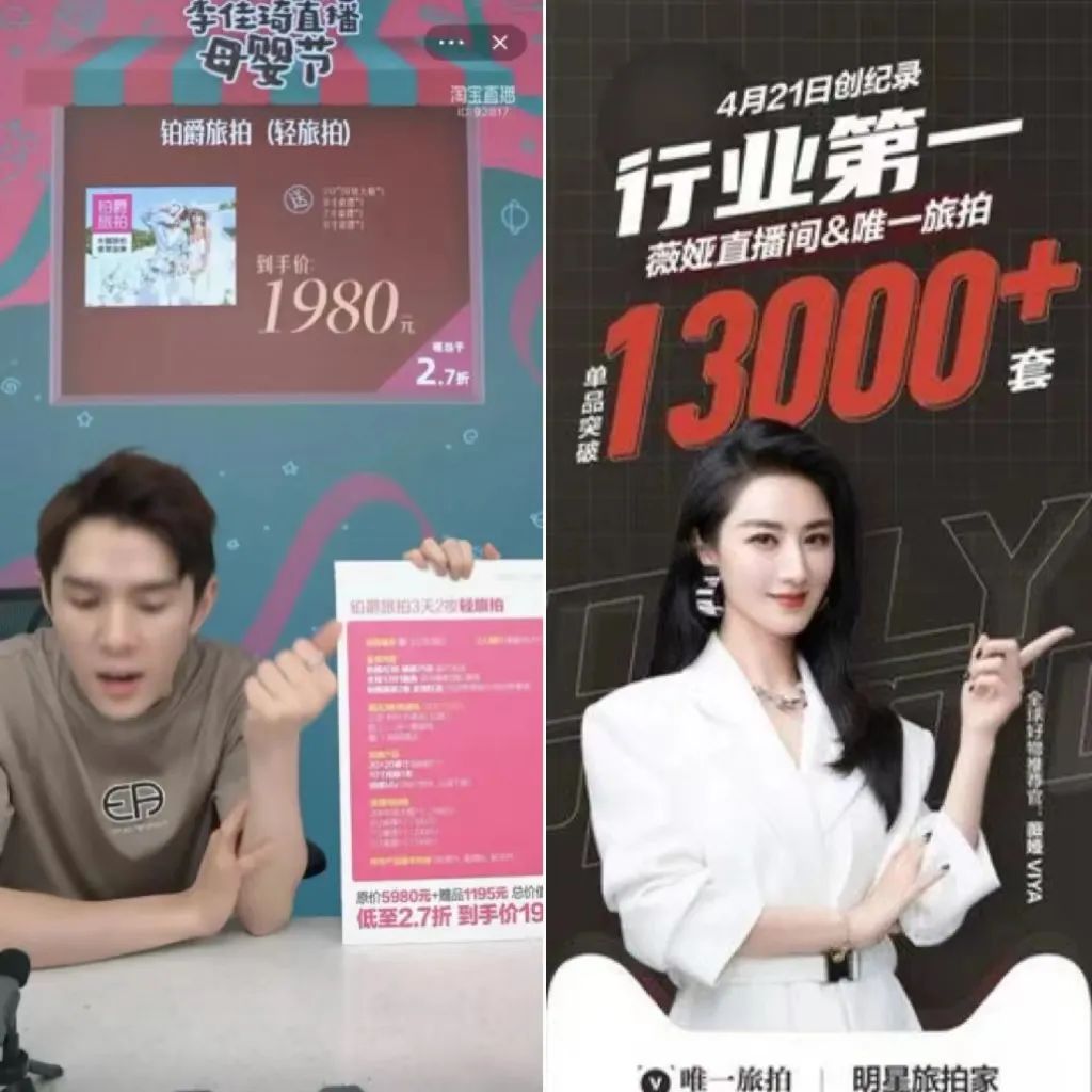 此外,直播也為婚紗旅拍的宣傳和營(yíng)銷提供了絕佳的窗口。業(yè)內(nèi)兩個(gè)頭部玩家唯一旅拍、鉑爵旅拍分別在2021年上了“帶貨一姐”薇婭、“口紅一哥”李佳琦的淘寶直播間,唯一旅拍在薇婭直播里單品銷量突破13000件,銷售額破2500萬(wàn)元;至于鉑爵旅拍,能夠查到的公開(kāi)信息中是兩個(gè)單品共計(jì)賣出1萬(wàn)+套,總銷售額近3500萬(wàn),按照官方的說(shuō)法,這是旅拍行業(yè)目前單場(chǎng)直播單品銷售的最好記錄。