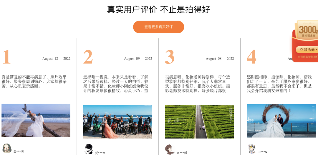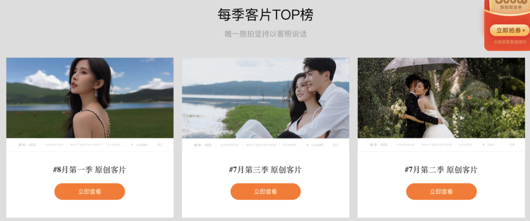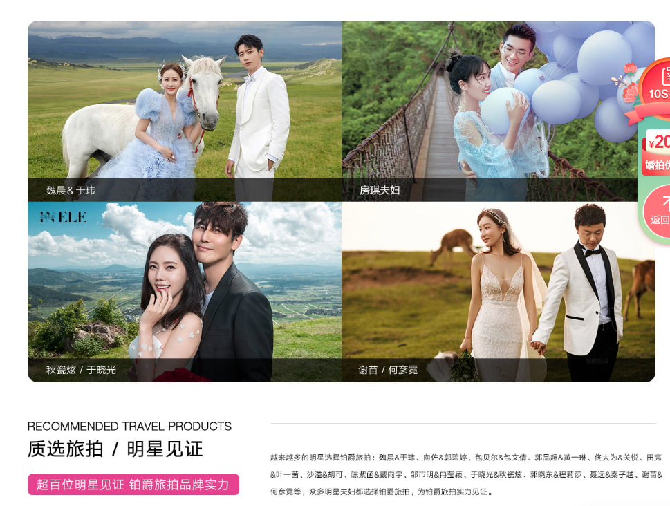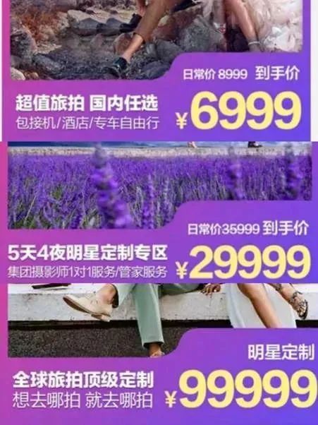 在如今賣個(gè)什么都可以帶上“明星同款”的年代,本就在明星當(dāng)中十分流行的婚紗旅拍自然不會(huì)落下,同時(shí),為了更具說(shuō)服力,各大公司還在宣傳中著重突出素人的評(píng)價(jià)。