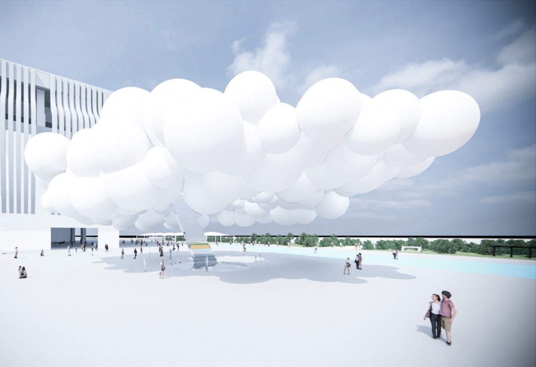 “設計之夢”位于主展館和主會場中間的廣場,成為了一朵不會飄走的云,設計團隊采用環(huán)狀氣球群營造出了云朵般奇妙的半室外空間。