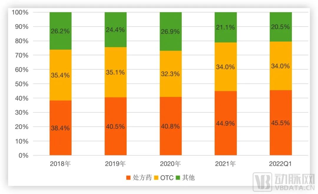 據(jù)中康CMH的數(shù)據(jù),處方藥占比呈逐年提升態(tài)勢(shì)。2018年,處方藥在全國零售藥品市場(chǎng)銷售額占比38.4%,截至2022Q1,該占比已提升至45.5%,上升了7.1個(gè)百分點(diǎn)。OTC在此期間占比較為穩(wěn)定,維持在34~35%左右。