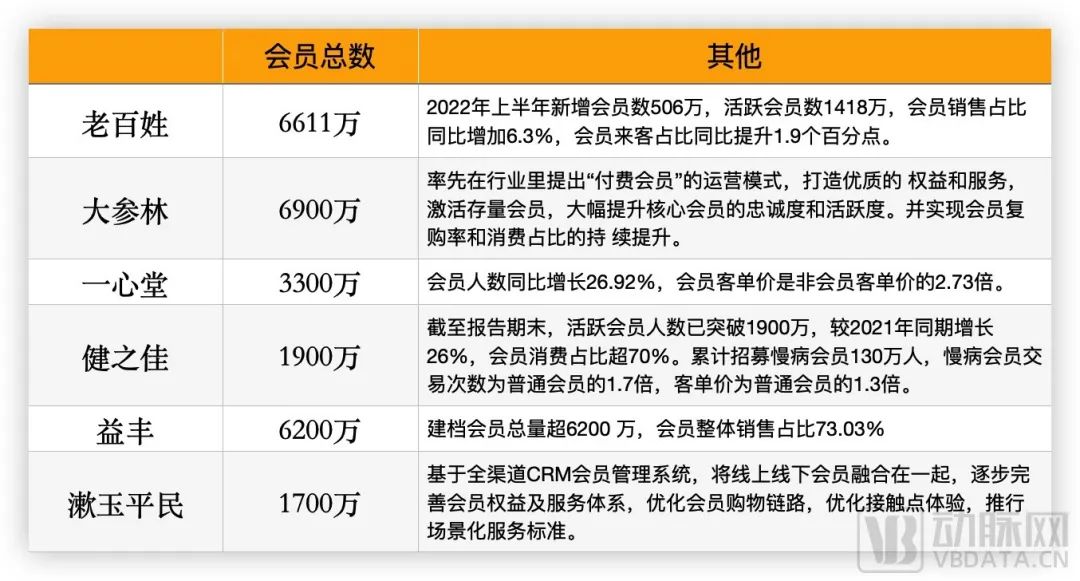 以老百姓大藥房的半年報(bào)數(shù)據(jù)為例,截至2022年6月30日,會(huì)員總數(shù)為6611萬,其中上半年新增506萬,活躍會(huì)員數(shù)1418萬,會(huì)員銷售占比6.3%,會(huì)員來客占比1.9%??梢钥吹?,對(duì)于會(huì)員的運(yùn)營還處于一個(gè)較為初級(jí)的階段。