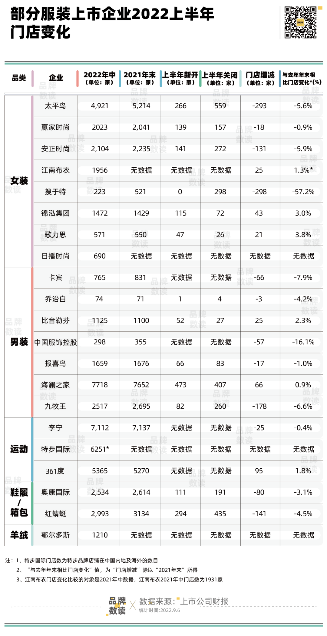 從渠道來看,門店升級和渠道優(yōu)化成為上市服飾企業(yè)的共識,上半年開關(guān)店調(diào)整并行,優(yōu)化加盟商門店,擴(kuò)大直營門店占比。在公布門店數(shù)據(jù)的20個上市公司里,品牌數(shù)讀粗略計(jì)算,門店規(guī)模整體在收縮,與2021年末相比平均減少了6%的門店。