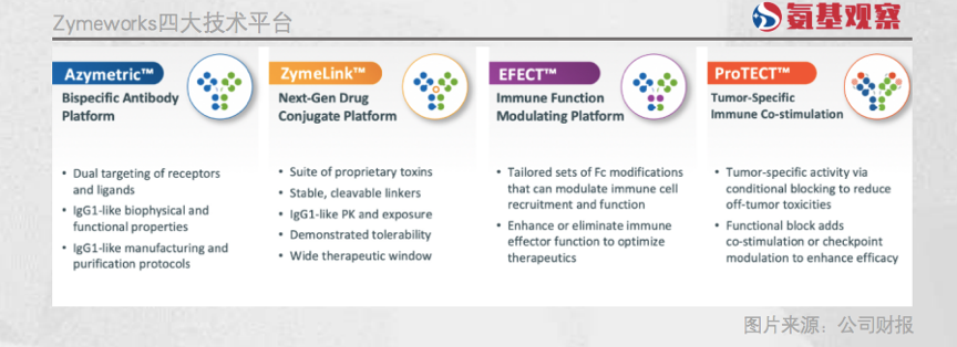 另外,Zymeworks還擁有PROTECT(能在減少全身毒性的同時(shí)提高療效)、EFFECT(主要作用是定制和優(yōu)化免疫反應(yīng))技術(shù)平臺(tái)。