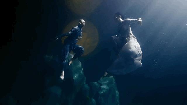 節(jié)目中為了拍攝兩位舞蹈演員在水下飛起打斗和對(duì)穿旋轉(zhuǎn)的畫面,采用了水下威亞的方法。