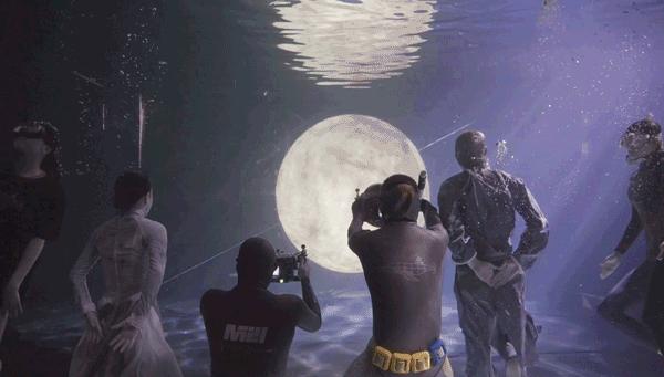 拍攝一個(gè)角度,就要將超大月亮從水中吊起再放入水下,一次微小變動(dòng)則需要花半小時(shí)的時(shí)間完成,一次因?yàn)樗畨簡(jiǎn)栴},在挪動(dòng)月亮的時(shí)候道具直接碎掉。