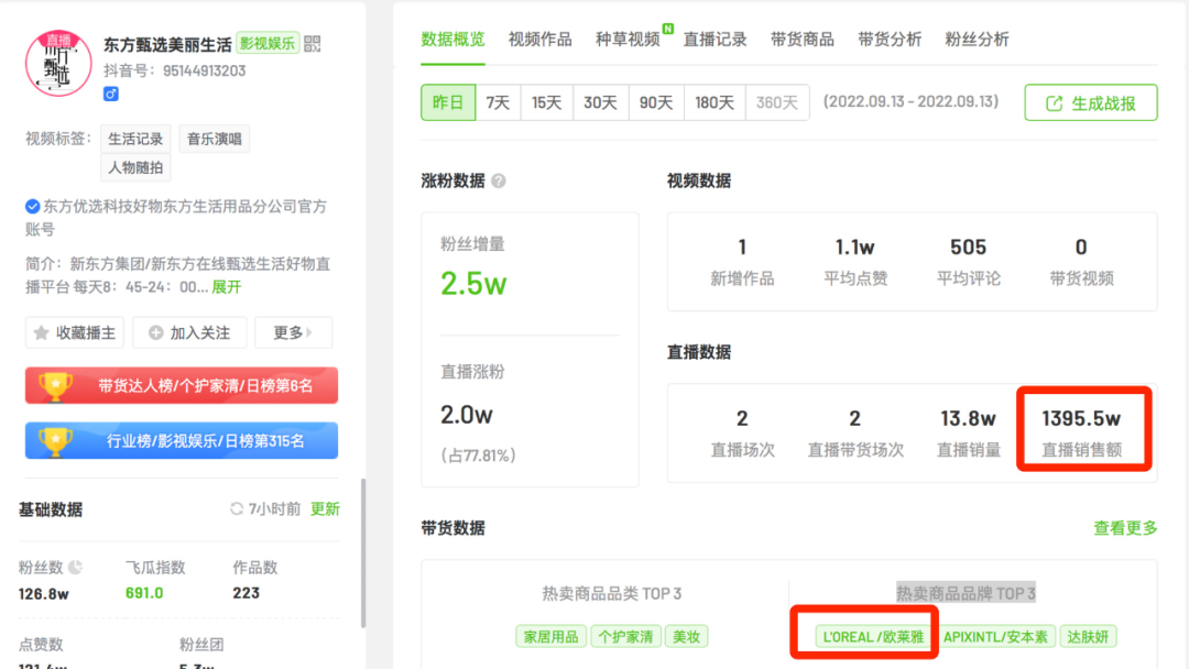 9月13日,飛瓜數(shù)據(jù)顯示,東方甄選美麗生活單日直播銷售額達(dá)1395.5w,熱賣品牌TOP3中包括巴黎歐萊雅。